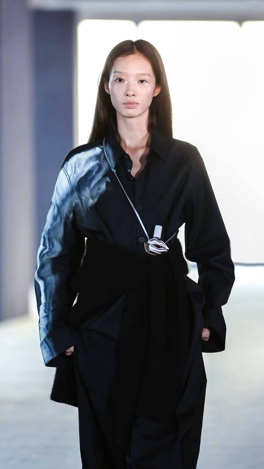 T台上,模特走秀的身影与鳞次栉比的摩天大楼光影交错,映衬出些许超现实主义的流动感。廓形随灯光与模特步伐流动,时间在空间中缓缓延展。观众仿佛置身于服装与艺术交错的场域,感受每件作品中承载的记忆与情感。